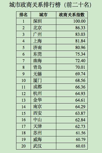 人大国发院研究员、经济学院教授聂辉华团队制作了《中国城市政商关系排行榜2020》。据该排行榜,政商关系健康总指数前10名的城市是深圳、北京、广州、上海、济南、东莞、珠海、青岛、无锡、厦门。