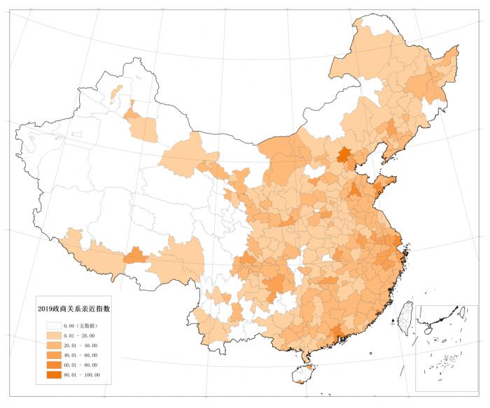 和政商关系健康总指数的分布类似,东南沿海地区和东部沿海地区的城市亲近指数得分较高