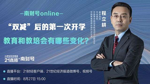 8月27日15:00,南财号online连线中央团校、中国青年政治学院培训中心副主任,中国教育电视台特约评论员程立耕,一起探讨“双减”落地带来的具体影响。
