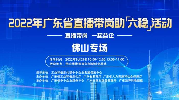 欢迎大家来到直播间一起云参与2022年广东省直播带岗助“六稳”线上招聘会。本次活动由工业和信息化部中小企业发展促进中心指导,广东省工业和信息化厅、广东省教育厅、广东省人力资源和社会保障厅主办,广东省中小企业服务中心、广东省就业服务管理局、广东经济科教频道承办。
