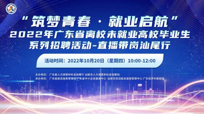 为深入贯彻落实党中央、国务院、省委省政府关于促进高校毕业生就业工作决策部署,进一步促进我省离校未就业高校毕业生尽快实现就业,由广东省人力资源和社会保障厅、汕尾市人力资源和社会保障局主办,广东省就业服务管理局、广东省中小企业服务中心、汕尾市劳动就业服务管理中心、广东经济科教频道承办的“筑梦青春·就业启航”2022年广东省离校未就业高校毕业生系列招聘活动——直播带岗汕尾行将于10月31日10:00-12:00进行,敬请关注。