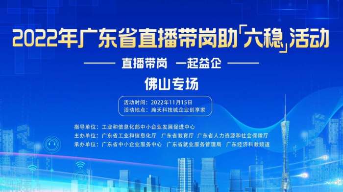 欢迎大家来到直播间一起云参与2022年广东省直播带岗助“六稳”线上招聘会。本次活动由工业和信息化部中小企业发展促进中心指导,广东省工业和信息化厅、广东省教育厅、广东省人力资源和社会保障厅主办,广东省中小企业服务中心、广东省就业服务管理局、广东经济科教频道承办。2022年直播带岗助“六稳”活动将以“直播带岗 一起益企”为主题开展90场线上招聘会。本次活动跨度为半年,将持续开展至2022年底,接下来我们将继续深入地市、园区、基地、企业及高校,助力缓解民生就业现状,精准解决企业招人难、学生就业难等问题。直播活动将于11月15日在佛山南海开展专场直播,本场为【佛山专场】南海企业首场直播,会有哪些企业来到我们的直播间,给我们带来怎么样的岗位,敬请期待!
