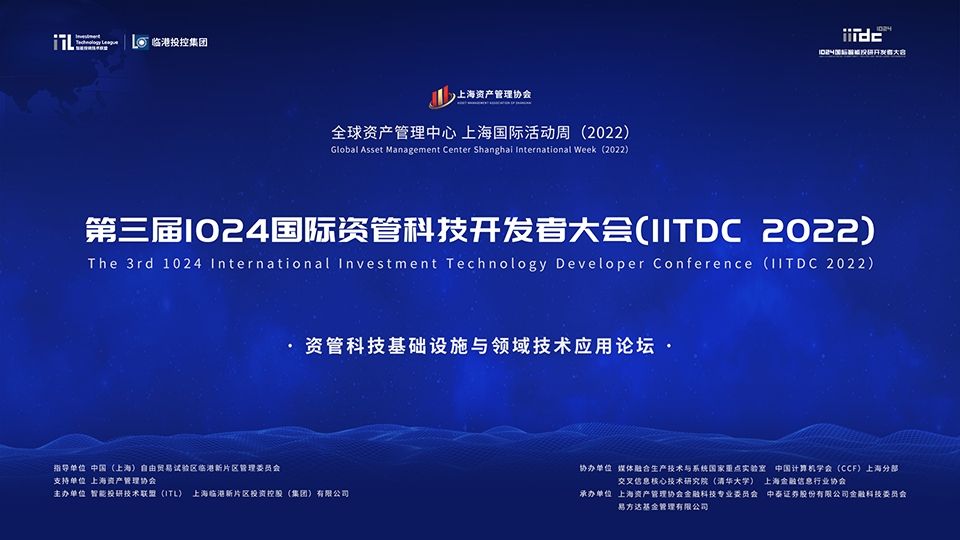 本次“IITDC第三届1024国际资管科技开发者大会”由中国(上海)自由贸易试验区临港新片区管理委员会指导,上海资产管理协会支持,智能投研技术联盟(ITL)、上海临港新片区投资控股(集团)有限公司联合主办,媒体融合生产技术与系统国家重点实验室、中国计算机学会(CCF)上海分部、交叉信息核心技术研究院(清华大学)、上海金融信息行业协会协办上海资产管理协会金融科技专业委员会、中泰证券股份有限公司金融科技委员会、易方达基金管理有限公司承办。围绕《上海国际金融中心建设“十四五”规划》中提到打造“两中心、两枢纽、两高地”。在未来智能投研技术联盟(ITL)将继续聚焦资管科技领域,围绕相关专业领域推动更多领域专委会的成立,推动资管科技评测标准和评测体系的简历,利用资管科技相关能力服务行业监管,推动资管机构、资管科技公司在人才交流、技术研修方面加强互动与交流,立足上海服务全国。