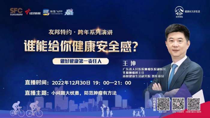 什么时候,您才会开始关注自己的健康?血脂、血压、血糖数据不正常的时候?长结节的时候?健康,从现在就该开始关注!2023年《岭南大医生》携手友邦保险,联合多位健康医学领域权威大咖,为您带来《友邦特约•跨年系列演讲——谁能给你健康安全感?》系列直播!12月30日19:00-21:00,特别邀请广东省人民医院肿瘤医院副院长王坤,开展《小问题大忧患,防范肿瘤有办法》主题直播!敬请期待。