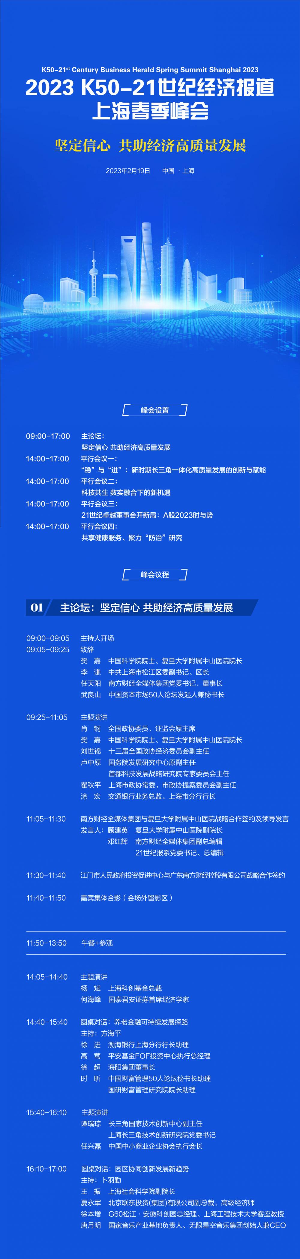 由长三角区域合作办公室、上海市松江区人民政府、复旦大学附属中山医院、南方财经全媒体集团指导,中国资本市场50人论坛(K50智库)、《21世纪经济报道》联合主办的“2023 K50-21世纪经济报道上海春季峰会”于2023年2月19日隆重举办。峰会以“坚定信心 共助经济高质量发展”为主题,旨在打造政府、专家、资本、产业之间的高端交流平台,为新时期中国经济高质量发展提供决策咨询支持,吹响2023经济创新发展冲锋号。
