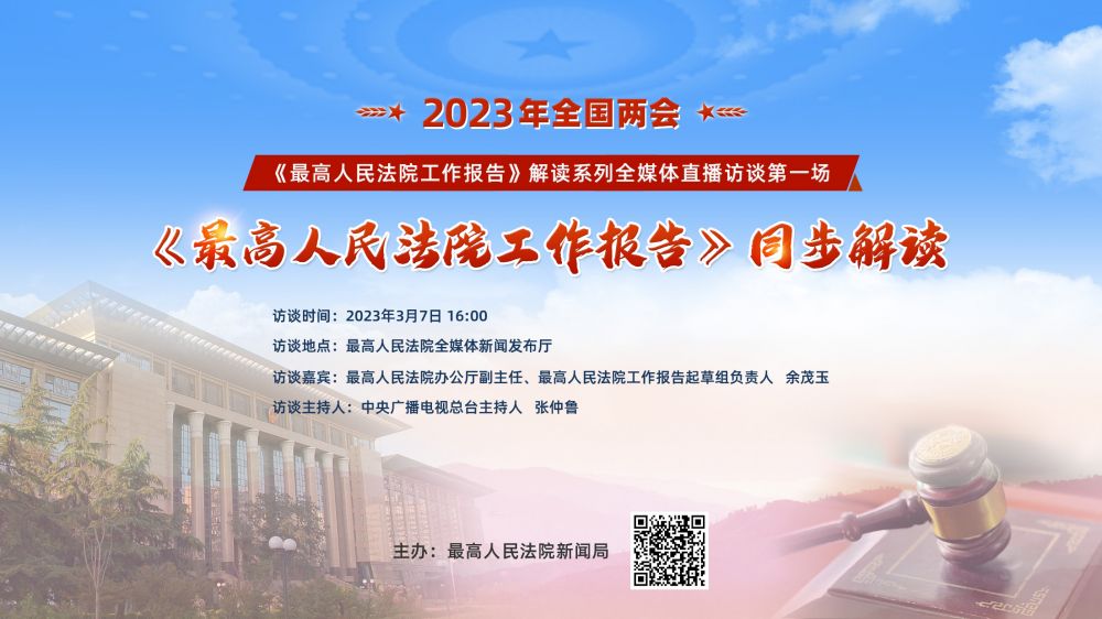 2023年3月7日至12日,最高人民法院新闻局将举办2023年全国两会《最高人民法院工作报告》解读系列全媒体直播访谈,访谈共分6场,分别由最高人民法院办公厅、刑一庭、民一庭、研究室、审管办、司改办、信息中心相关负责人接受访谈,解读最高人民法院工作亮点,介绍人民法院工作新进展新成就。