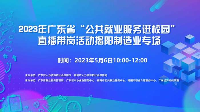 落实全省高质量发展大会部署,坚持稳中求进工作总基调,促进我省青年特别是高校毕业生高质量充分就业,推动公共就业服务向前延伸、提质增效,满足高校毕业生多层次、全方位、精准化服务需求。由广东省人力资源和社会保障厅、揭阳市人力资源和社会保障局主办,广东省就业服务管理局、广东省中小企业服务中心、揭阳市公共就业服务中心、揭阳市职业介绍服务中心、广东经济科教频道承办的2023年广东省“公共就业服务进校园”直播带岗活动——揭阳制造业专场将于5月6日10:00-12:00进行。