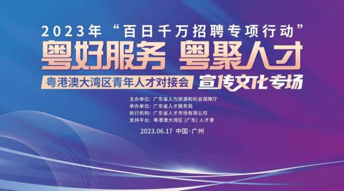 欢迎来到2023年“百日千万招聘专项行动” 粤好服务 粤聚人才【粤港澳大湾区青年人才对接会宣传文化专场活动】的直播间,广东经济科教频道将配合活动开展直播带岗线上招聘会,直播将于2023年6月17日10:00-12:00在粤港澳大湾区(广东)人才港开展,敬请期待!