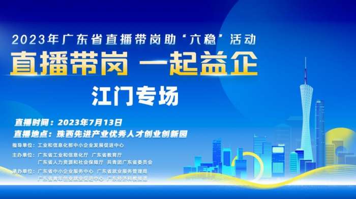今年,直播带岗助“六稳”活动将以“直播带岗 一起益企”为主题开展70场线上招聘会,本次是第29场。本场为【江门专场】直播活动,将于2023年7月13日10:00-12:00开播,敬请期待!