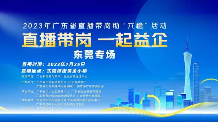 今年,直播带岗助“六稳”活动将以“直播带岗 一起益企”为主题开展70场线上招聘会,本次是第40场。本场为【东莞专场】直播活动,将于2023年7月25日15:00-17:00开播,敬请期待!