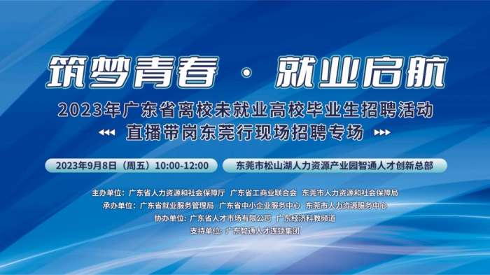 为深入贯彻党中央、国务院和省委、省政府关于促进高校毕业生就业工作决策部署,促进我省2023届离校未就业高校毕业生等青年群体尽快就业,广东省人力资源和社会保障厅于7-12月组织开展2023年“筑梦青春·就业启航”广东省离校未就业高校毕业生招聘活动,搭建线上线下供求对接平台,持续提供招聘岗位和就业服务。由广东省人力资源和社会保障厅、广东省工商业联合会、东莞市人力资源和社会保障局主办,广东省就业服务管理局、广东省中小企业服务中心、东莞市人力资源服务中心承办,广东省人才市场有限公司、广东经济科教频道协办,广东智通人才连锁集团支持的“筑梦青春·就业启航” 2023年广东省离校未就业高校毕业生招聘活动——直播带岗东莞行现场招聘专场将于9月8日(周五)10:00-12:00进行。