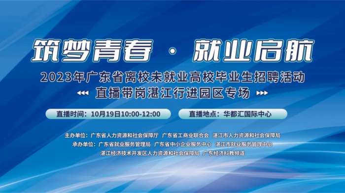 为深入贯彻党中央、国务院和省委、省政府关于促进高校毕业生就业工作决策部署,促进我省2023届离校未就业高校毕业生等青年群体尽快就业,广东省人力资源和社会保障厅于7-12月组织开展2023年“筑梦青春·就业启航”广东省离校未就业高校毕业生招聘活动,搭建线上线下供求对接平台,持续提供招聘岗位和就业服务。由广东省人力资源和社会保障厅、广东省工商业联合会、湛江市人力资源和社会保障局主办,广东省就业服务管理局、广东省中小企业服务中心、湛江市就业服务管理中心、湛江经济技术开发区人力资源和社会保障局、广东经济科教频道承办的“筑梦青春·就业启航” 2023年广东省离校未就业高校毕业生招聘活动——直播带岗湛江行进园区专场将于10月19日(周四)进行。