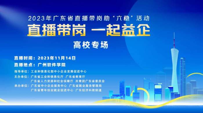 本次项目系2023年广东省直播带岗助“六稳”专场直播活动,由工业和信息化部中小企业发展促进中心指导,广东省工业和信息化厅、广东省教育厅、广东省人力资源和社会保障厅及共青团广东省委员会共同主办,广东省中小企业服务中心、广东省就业服务管理局、广东省青年创业就业促进中心以及广东经济科教频道共同承办。
