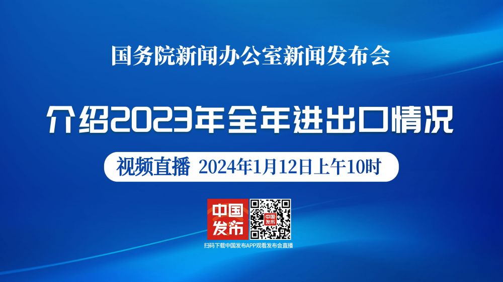国务院新闻办公室于2024年1月12日(星期五)上午10时举行新闻发布会,请海关总署副署长王令浚介绍2023年全年进出口情况,并答记者问。