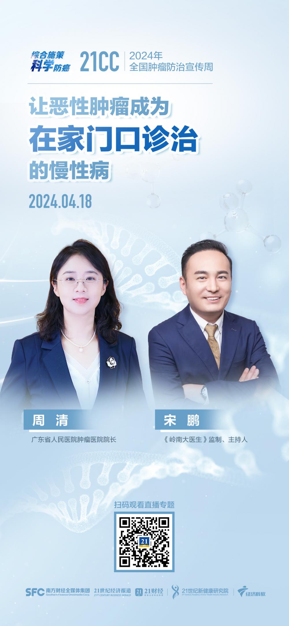 2024年4月15-21日是第30个全国肿瘤防治宣传周,根据国家卫健委通知,今年宣传周主题为“综合施策 科学防癌”, 为助力健康中国建设,发挥主流媒体责任与传播优势,南方财经全媒体集团旗下《21世纪经济报道》、21世纪新健康研究院、广东经济科教频道《岭南大医生》特联合策划推出“21CC|2024年全国肿瘤防治宣传周系列直播”,邀请国内临床大咖,每日聚焦一个主题,围绕“综合施策 科学防癌”深入科普肿瘤防治相关知识,传播科学防癌理念,传递预防、治疗前沿信息,增强公众防治癌症意识与信心。