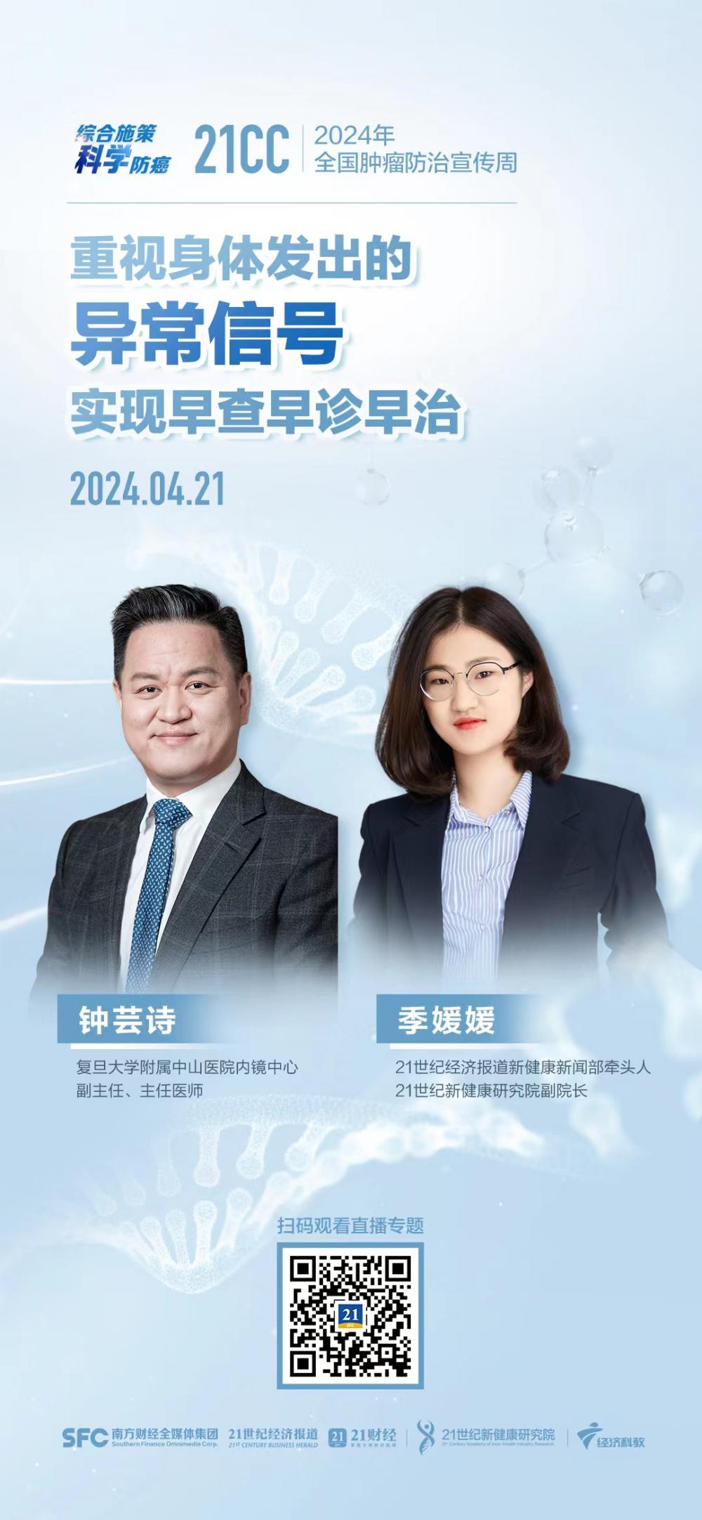 2024年4月15-21日是第30个全国肿瘤防治宣传周,根据国家卫健委通知,今年宣传周主题为“综合施策 科学防癌”, 为助力健康中国建设,发挥主流媒体责任与传播优势,南方财经全媒体集团旗下《21世纪经济报道》、21世纪新健康研究院、广东经济科教频道《岭南大医生》特联合策划推出“21CC|2024年全国肿瘤防治宣传周系列直播”,邀请国内临床大咖,每日聚焦一个主题,围绕“综合施策 科学防癌”深入科普肿瘤防治相关知识,传播科学防癌理念,传递预防、治疗前沿信息,增强公众防治癌症意识与信心。