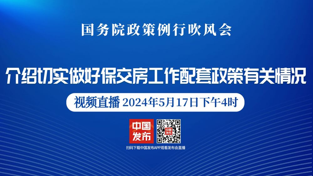 国务院新闻办公室于2024年5月17日(星期五)下午4时举行国务院政策例行吹风会,请住房城乡建设部和自然资源部、中国人民银行、国家金融监督管理总局负责人介绍切实做好保交房工作配套政策有关情况,并答记者问。