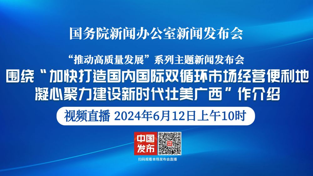 国务院新闻办公室于2024年6月12日(星期三)上午10时举行“推动高质量发展”系列主题新闻发布会,请广西壮族自治区党委副书记、自治区主席蓝天立围绕“加快打造国内国际双循环市场经营便利地 凝心聚力建设新时代壮美广西”作介绍,并答记者问。
