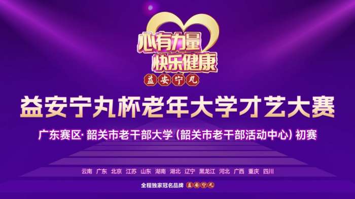 2024年7月1日14:00,由广东省老龄产业协会指导,广东经济科教频道主办、康朝药业有限公司,大参林医药集团股份有限公司协办,韶关市老干部大学(韶关市老干部活动中心)支持的“心有力量 快乐健康”益安宁丸杯老年大学才艺大赛韶关市初赛在韶关市老干部大学(韶关市老干部活动中心)举行。心有力量,快乐健康!现诚邀年满60周岁的老年朋友,与全国老年朋友共享文化盛宴。