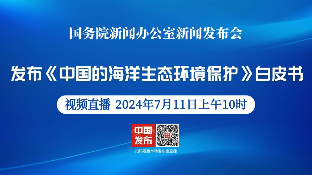 国务院新闻办公室于2024年7月11日(星期四)上午10时举行新闻发布会,发布《中国的海洋生态环境保护》白皮书,请自然资源部副部长、国家海洋局局长孙书贤,生态环境部副部长郭芳和国务院新闻办公室新闻发言人出席,介绍白皮书有关情况并答记者问。