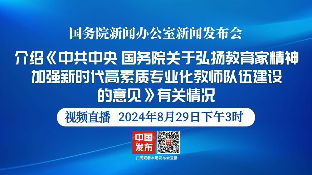 国务院新闻办公室于2024年8月29日(星期四)下午3时举行新闻发布会,教育部副部长王嘉毅介绍《中共中央 国务院关于弘扬教育家精神加强新时代高素质专业化教师队伍建设的意见》有关情况,并答记者问。