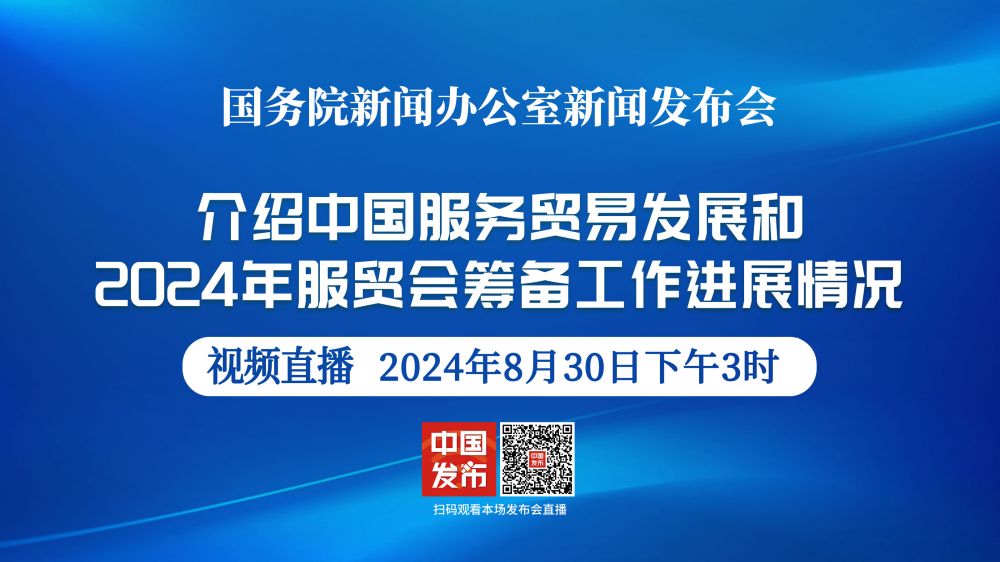 国务院新闻办公室定于2024年8月30日(星期五)下午3时举行新闻发布会,请商务部部长助理唐文弘、北京市副市长司马红介绍中国服务贸易发展和2024年服贸会筹备工作进展情况,并答记者问。