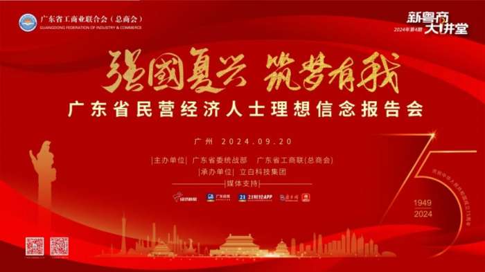 喜迎新中国成立75周年,广东省委统战部、广东省工商联2024年9月20日下午3:00-5:30于广东省民营经济人士理想信念教育基地——立白科技集团举行“强国复兴、筑梦有我”全省民营经济人士理想信念报告会:广东省工商联名誉会长、立白凯晟控股董事局主席、立白科技集团创始人、总顾问陈凯旋,广东省工商联副主席、星河湾集团总裁黄健慧,珠江钢管集团有限公司执行董事、新时代粤商提升工程研修班班长陈兆年,华大集团董事、党委书记,华大基因首席运营官杜玉涛,深圳市高巨创新科技开发有限公司总经理高健作主题报告,广东省委党校原副校长、教授,省政府原参事陈鸿宇作相关主旨宣讲。