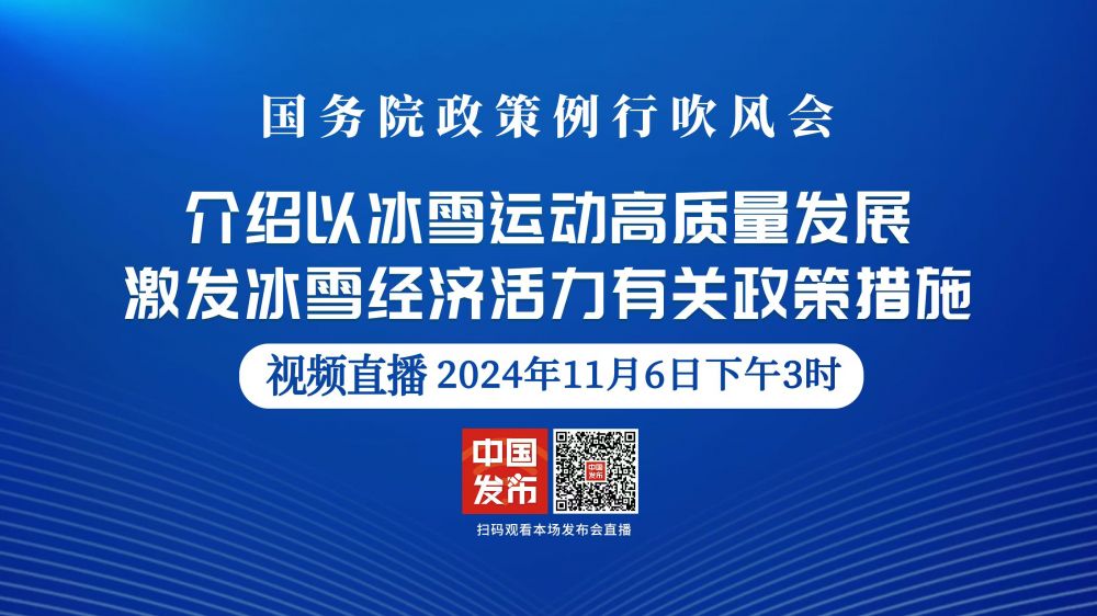 国务院新闻办公室于2024年11月6日(星期三)下午3时举行国务院政策例行吹风会,请国家体育总局副局长李静和国家发展和改革委员会、工业和信息化部、文化和旅游部有关负责人介绍以冰雪运动高质量发展激发冰雪经济活力有关政策措施,并答记者问。