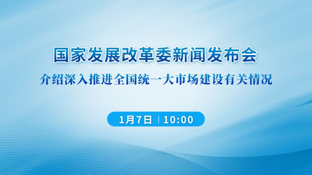 国家发展改革委于1月7日(星期二)上午10:00在国家发改委中配楼三层大会议室,召开国家发展改革委专题新闻发布会,介绍深入推进全国统一大市场建设有关情况。