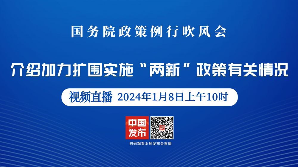 国务院新闻办公室于2025年1月8日(星期三)上午10时举行国务院政策例行吹风会,请国家发展改革委副主任赵辰昕和财政部、商务部、中国人民银行、市场监管总局有关负责人介绍加力扩围实施“两新”政策有关情况,并答记者问。敬请关注!