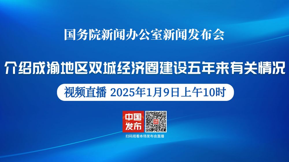 国务院新闻办公室于2025年1月9日(星期四)上午10时举行新闻发布会,请国家发展改革委副秘书长陈亚军,重庆市委常委、常务副市长陈新武,四川省副省长李文清,成都市委常委、常务副市长曹俊杰介绍成渝地区双城经济圈建设五年来有关情况,并答记者问。