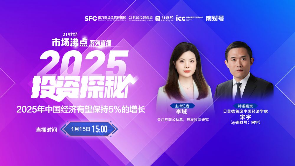 1月15日15:00,贝莱德首席中国经济学家宋宇做客21财经市场沸点直播间,深度剖析2025年宏观经济走势,分享他对中国经济增长的预测,探讨实现约5%增长目标所需的政策支持。