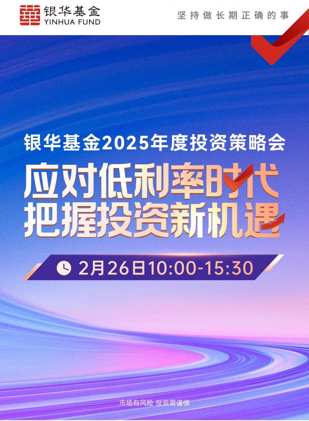 当下,低利率时代的浪潮正席卷全球,市场环境愈发复杂多变,在此背景下,投资者该如何配置资产?银华基金2025年度投资策略会,将于2月26日10:00重磅来袭,用全新视角,带您拨开重重迷雾,把握投资新机遇!