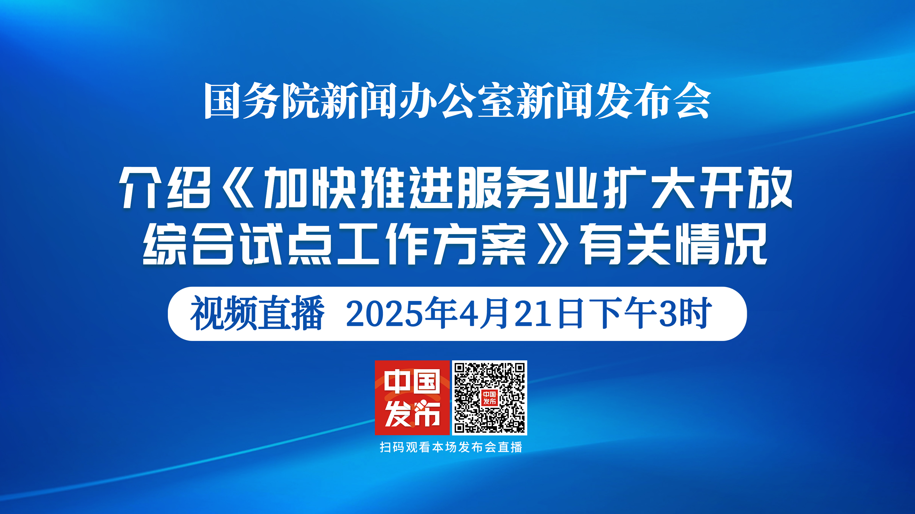 国务院新闻办公室于2025年4月21日(星期一)下午3时举行新闻发布会,请商务部副部长兼国际贸易谈判副代表凌激和工业和信息化部、国家卫生健康委、中国人民银行有关负责人介绍《加快推进服务业扩大开放综合试点工作方案》有关情况,并答记者问。