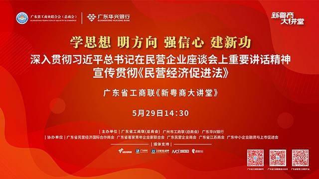 《中华人民共和国民营经济促进法》于5月20日起正式施行。为加强对新法的学习和宣传贯彻,提振广东民营企业和民营企业家发展信心,推动民营经济健康发展、高质量发展,广东省工商联5月29日(周四)14:30在广东华兴银行以“线下+线上(视频)”方式举办深入贯彻习近平总书记在民营企业座谈会上重要讲话精神 宣传贯彻《民营经济促进法》——广东省工商联《新粤商大讲堂》