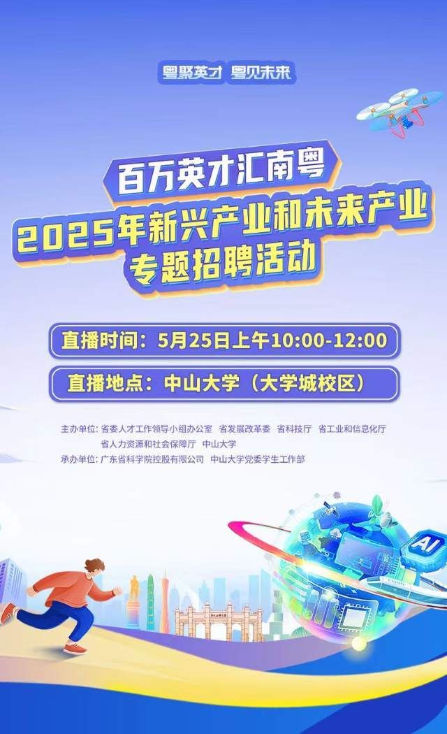 【百万英才汇南粤】2025年新兴产业和未来产业专题招聘活动由广东省委人才工作领导小组办公室、省发展改革委、省科技厅、省工业和信息化厅、省人力资源社会保障厅、中山大学主办,正在中山大学广州校区东校园体育馆火热进行中!