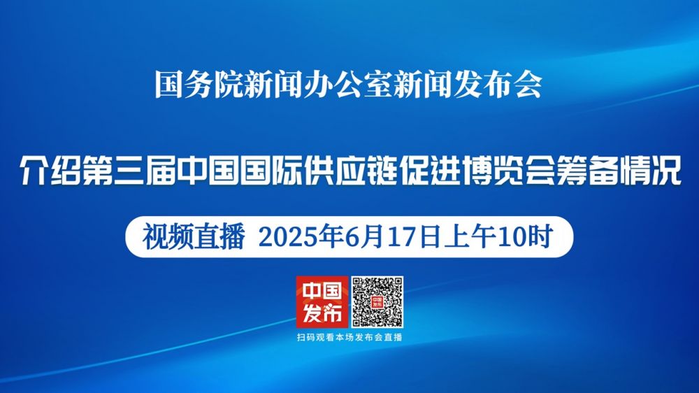 国务院新闻办公室于2025年6月17日(星期二)上午10时举行新闻发布会,请中国贸促会副会长于健龙、李兴乾介绍第三届中国国际供应链促进博览会筹备情况,并答记者问。