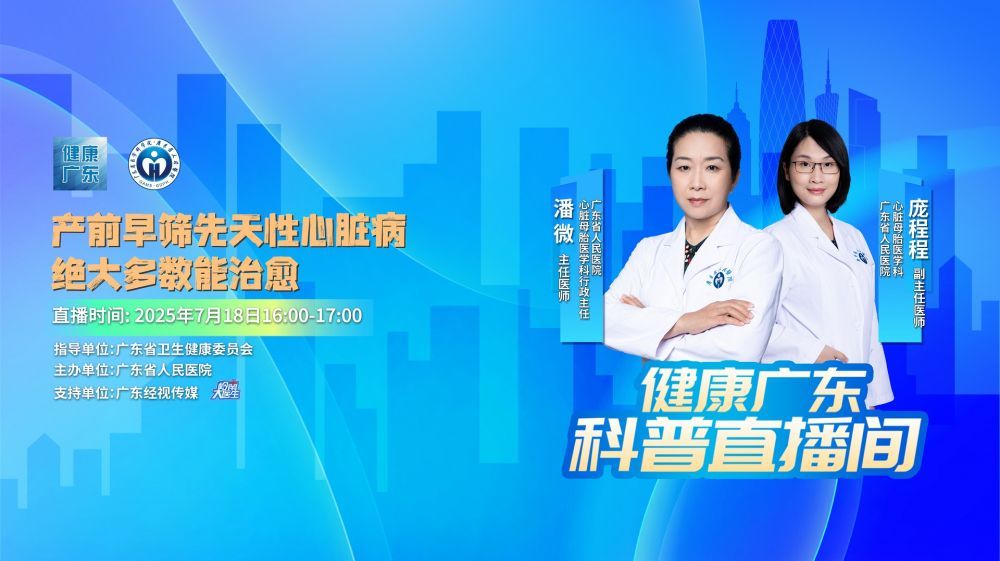 7月18日16:00-17:00,由广东省卫生健康委指导,广东省人民医院主办的健康广东科普直播间——心血管疾病防治科普专场第四场《产前早筛先天性心脏病,绝大多数能治愈》将准时开播。届时,广东省人民医院心脏母胎医学科行政主任潘微医生、心脏母胎医学科庞程程医生,将带您了解前沿的先天性心脏病防治方法!