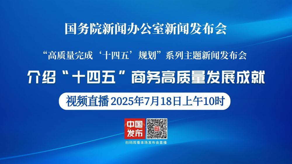 国务院新闻办公室于2025年7月18日(星期五)上午10时举行“高质量完成‘十四五’规划”系列主题新闻发布会,请商务部部长王文涛介绍“十四五”商务高质量发展成就,并答记者问。