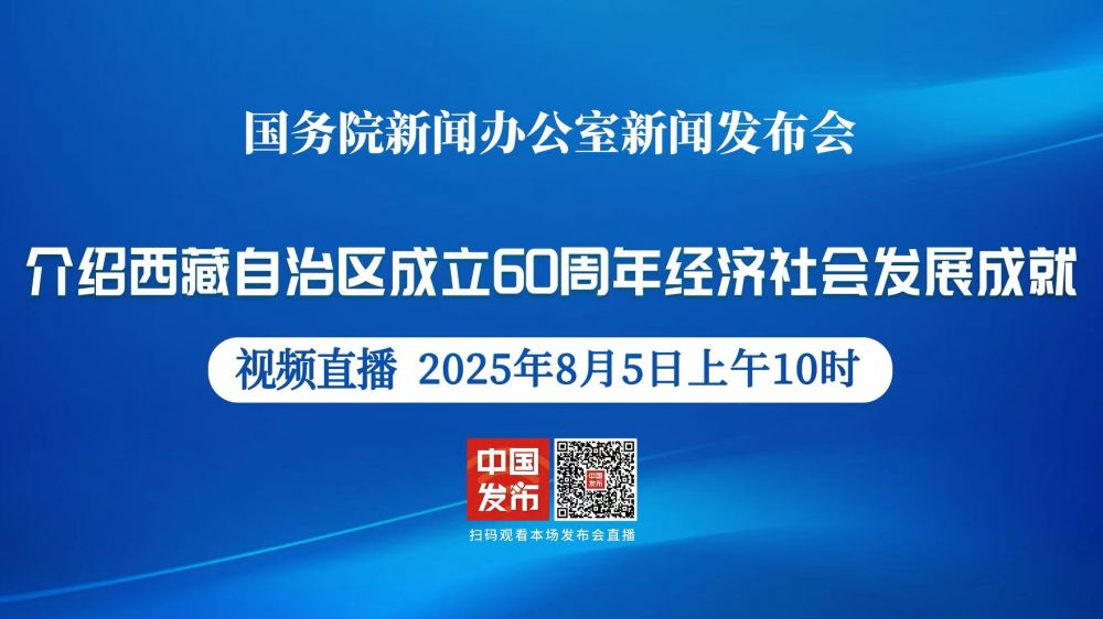 国务院新闻办公室于2025年8月5日(星期二)上午10时举行新闻发布会,请西藏自治区党委书记王君正,西藏自治区党委副书记、自治区主席嘎玛泽登介绍西藏自治区成立60周年经济社会发展成就,并答记者问。