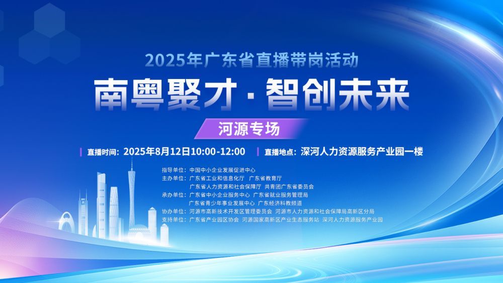 南粤聚才,智创未来!2025年广东省直播带岗活动将在2025年7月-12月开展40场线上招聘会,本场是第3场。本次为【河源专场】直播活动,将全程通过经视频APP进行直播。直播时间为2025年8月12日10:00-12:00,敬请期待!