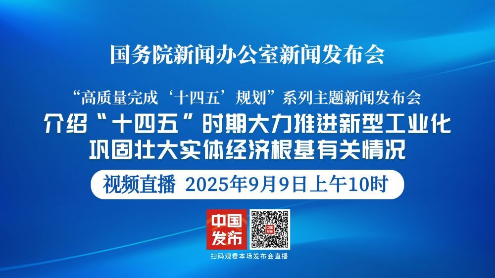 国务院新闻办公室于2025年9月9日(星期二)上午10时举行“高质量完成‘十四五’规划”系列主题新闻发布会,请工业和信息化部部长李乐成介绍“十四五”时期大力推进新型工业化,巩固壮大实体经济根基有关情况,并答记者问。