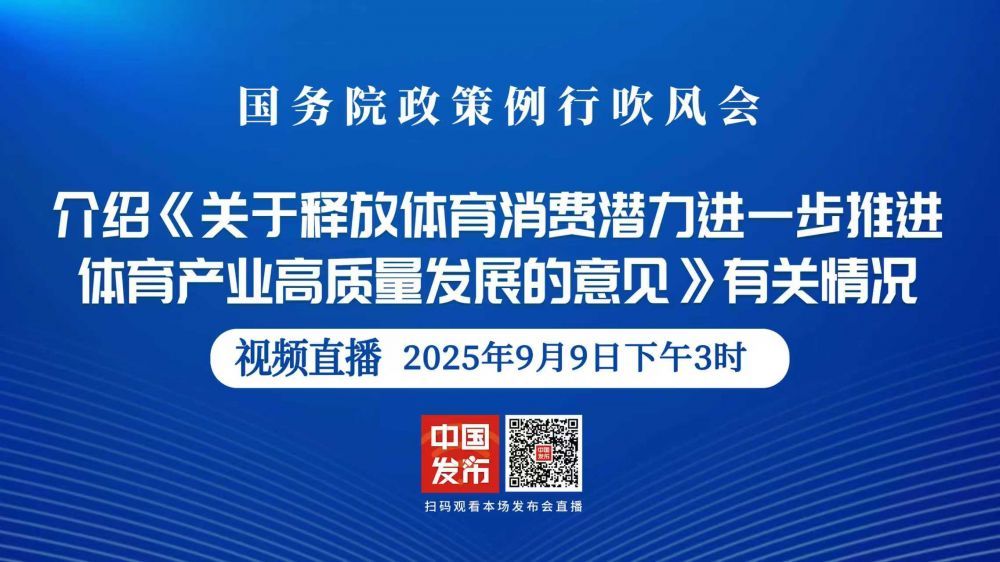 国务院新闻办公室将于2025年9月9日(星期二)下午3时举行国务院政策例行吹风会,请体育总局副局长李静和国家发展改革委、工业和信息化部、商务部有关负责人介绍《关于释放体育消费潜力进一步推进体育产业高质量发展的意见》有关情况,并答记者问。