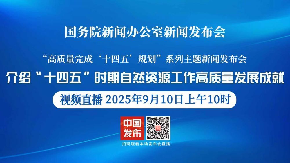 国务院新闻办公室于2025年9月10日(星期三)上午10时举行“高质量完成‘十四五’规划”系列主题新闻发布会,请自然资源部部长、国家自然资源总督察关志鸥,国家林草局(国家公园管理局)局长刘国洪介绍“十四五”时期自然资源工作高质量发展成就,并答记者问。