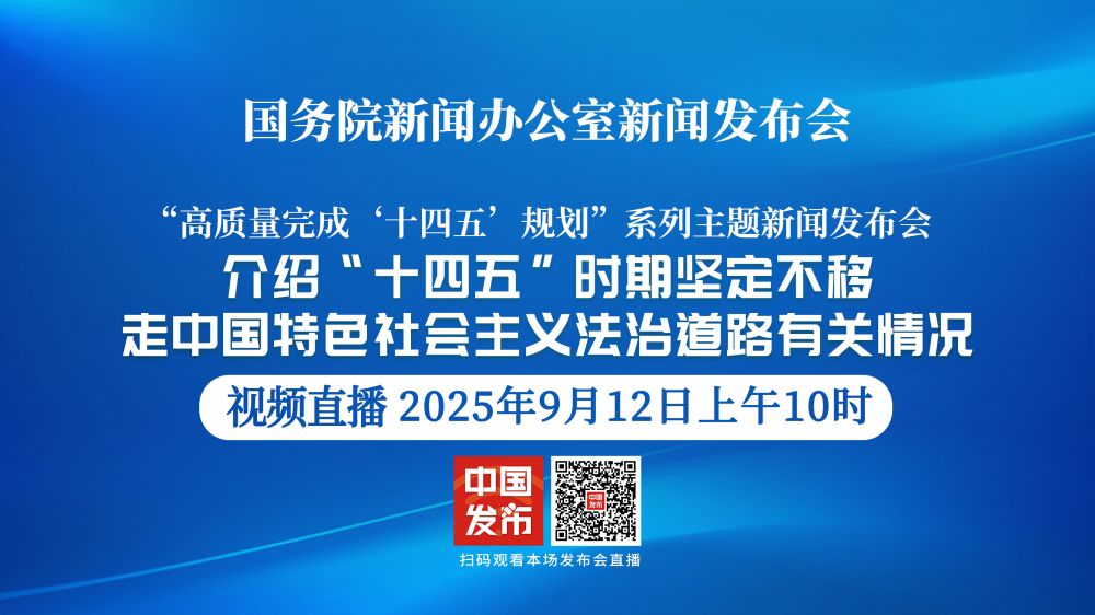 国务院新闻办公室于2025年9月12日(星期五)上午10时举行“高质量完成‘十四五’规划”系列主题新闻发布会,请中央政法委秘书长訚柏,全国人大常委会法工委主任沈春耀,最高人民法院副院长、二级大法官贺小荣,最高人民检察院副检察长、二级大检察官张雪樵,公安部副部长杨维林,司法部副部长吴言军介绍“十四五”时期坚定不移走中国特色社会主义法治道路有关情况,并答记者问。