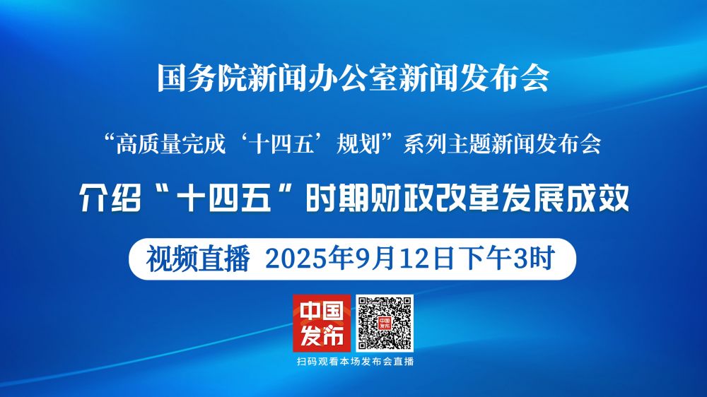 国务院新闻办公室将于2025年9月12日(星期五)下午3时举行“高质量完成‘十四五’规划”系列主题新闻发布会,请财政部部长蓝佛安介绍“十四五”时期财政改革发展成效,并答记者问。