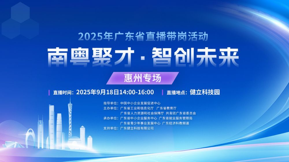 南粤聚才,智创未来!2025年广东省直播带岗活动将在2025年7月-12月开展40场线上招聘会,本场是第9场。本次为【惠州专场】直播活动,将全程通过经视频APP进行直播。直播时间为2025 年9月18日14:00-16:00,敬请期待!