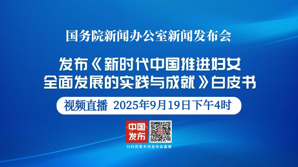 国务院新闻办公室将于2025年9月19日(星期五)下午4时举行新闻发布会,发布《新时代中国推进妇女全面发展的实践与成就》白皮书,请国务院妇女儿童工作委员会副主任,全国妇联副主席、书记处第一书记黄晓薇和国务院新闻办公室新闻发言人出席,介绍白皮书有关情况并答记者问。
