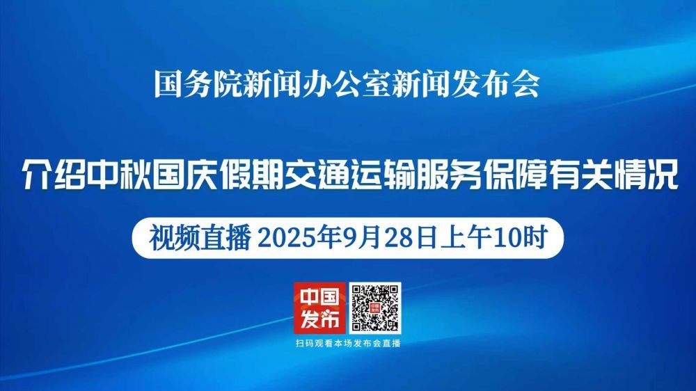 国务院新闻办公室将于2025年9月28日(星期日)上午10时举行新闻发布会,请交通运输部副部长李扬和国家铁路局、中国民航局、国家邮政局负责人介绍中秋国庆假期交通运输服务保障有关情况,并答记者问。