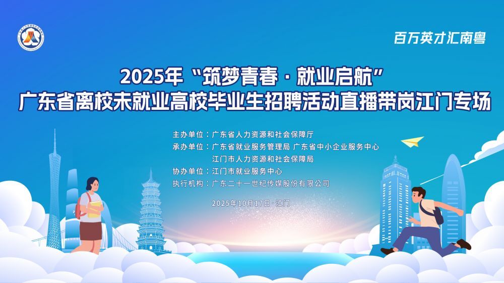 为深入贯彻党中央、国务院和省委、省政府关于促进高校毕业生就业工作的部署要求,落实“百万英才汇南粤”行动计划要求,促进我省高校毕业生尽快就业,广东省人力资源和社会保障厅组织开展2025年“筑梦青春·就业启航”广东省离校未就业高校毕业生招聘活动,搭建线上供求对接平台,持续提供招聘岗位和就业服务。由广东省人力资源和社会保障厅主办,广东省就业服务管理局、广东省中小企业服务中心、江门市人力资源和社会保障局承办,江门市就业服务中心协办,广东二十一世纪传媒股份有限公司支持的2025年“筑梦青春·就业启航"——广东省离校未就业高校毕业生招聘活动直播带岗江门专场将于10月17日(周五)10:00--12:00开启。